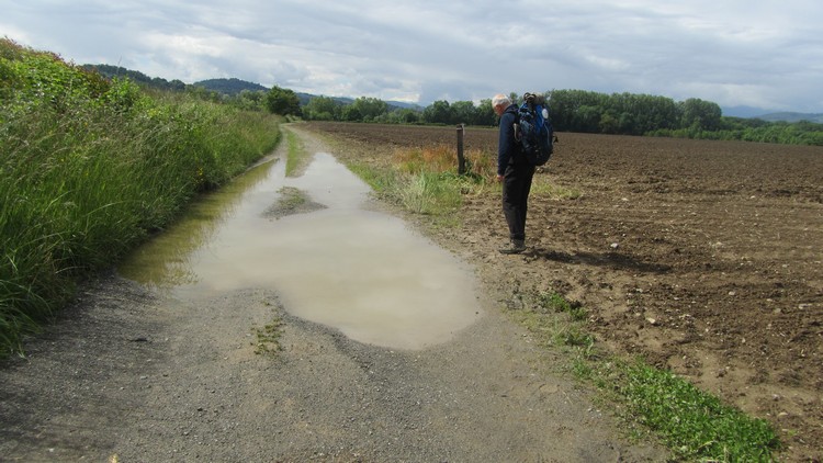 Passage d’eau et boue, nous devons chercher les pierres du chemin pour passer. Plus loin une flaque barre tout le chemin. Nous avons droit à quelques glissades mais, miracle, nous restons debout, les chaussures souffrent aussi.