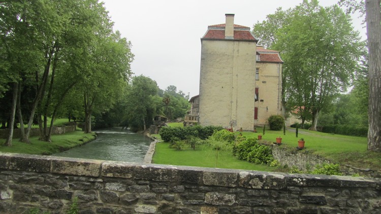 A midi, nous sommes à Uhart-Mixte, à l’entrée du village nous profitons de faire une photo d’un joli pont au dessus de la Bidouze avec en fond de tableau un joli manoir.