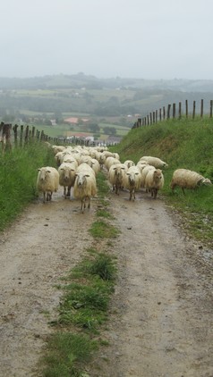 Nous nous effaçons le plus possible pour les laisser, ouah !!! c’est pire encore, le troupeau peureux s’arrête. Comme il pousse à l’arrière, les moutons finissent par passer. Au moment où il nous dépasse le berger se met à nous insulter : « on l’empêche de travailler, il en marre de voir défiler les pèlerins -les culs levés- (en référence au poncho qui recouvre les sacs) ».