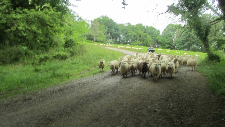 Toujours sous la pluie, nous reprenons le chemin qui monte derrière le restaurant. Vue agréable entre bois et pâture. Nous apercevons un peu en contrebas un troupeau de moutons. Nous constatons assez vite que le troupeau fait curieusement mouvement vers la clôture. Peu après, nous constatons que ce troupeau nous suit.
