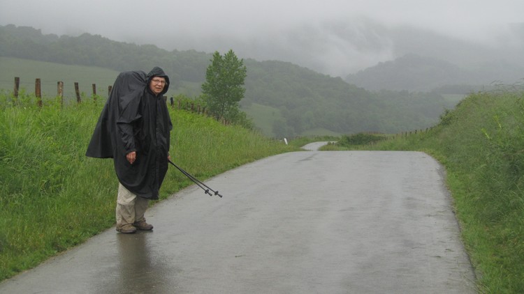 Lever à 6 H 30. Petit Déjeuner à 7 Heures, nous décollons à 7 H 50 et de nouveau sous la pluie. Routes et chemins se succèdent sous un ciel très gris et avec un sale crachin ne permettant pas de profiter du paysage.