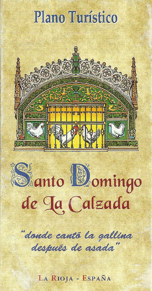 « En 1130, Hugonel, jeune pèlerin germanique en route avec ses parents vers Saint Jacques de Compostelle passa la nuit dans une auberge de Santo Domingo de la Calzada. Une jeune servante lui fit des avances, qu’il repoussa. Éconduite, elle cacha dans son bagage de la vaisselle d’argent. Au moment du départ, elle l’accusa du vol du plat. Il fut condamné et pendu pour ce vol qu’il n’avait pas commis. Les parents éplorés continuèrent leur pèlerinage et prièrent St Jacques. À leur retour de Compostelle, ils l’entendirent leur dire du haut du gibet qu’il vivait, car saint Jacques le protégeait. Émerveillés, ils s’adressèrent à l’alcade qui était en train de déguster un coq et une poule rôtis. Il leur répondit avec ironie : « Si votre fils est vivant, cette poule et ce coq se mettront à chanter dans mon assiette. » Ce qu’il advint, le coq chanta et la poule caqueta. L’alcalde bouleversé fit dépendre le jeune homme et pendre à sa place la fautive.