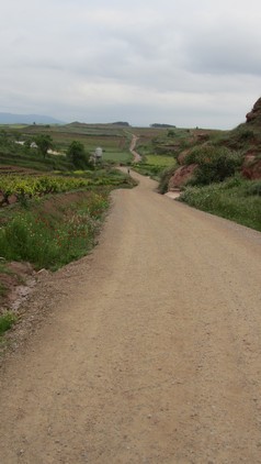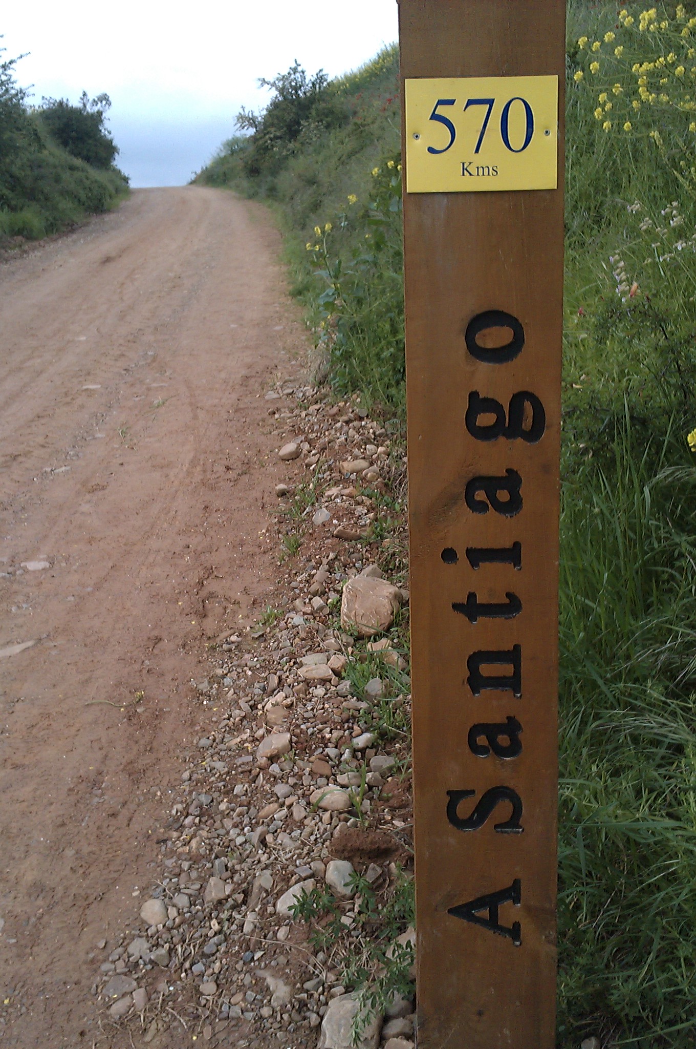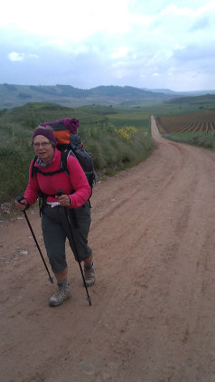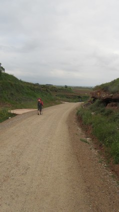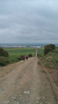 Nous nous alimentons toutes les 2 heures, ça nous permet de maintenir un bon rythme.Nous passons Azofra où quelques pèlerins prennent leur petit déjeuner. Toujours dans les vignes, le chemin monte tranquillement, excepté une côte qui de loin montre un défilé de pèlerins de bout en bout.