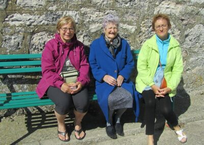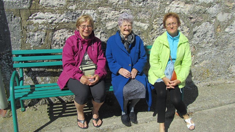 Une vieille dame assise sur un banc nous fait signe. Andrée et Annie la rejoignent. Elle essaie de bavarder mais très difficile de la comprendre. Elle habite juste à côté de l’église, apparemment elle aurait plus de 90 ans et veille sur l’église.