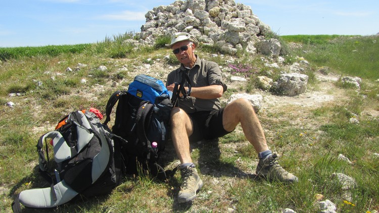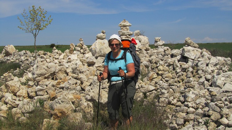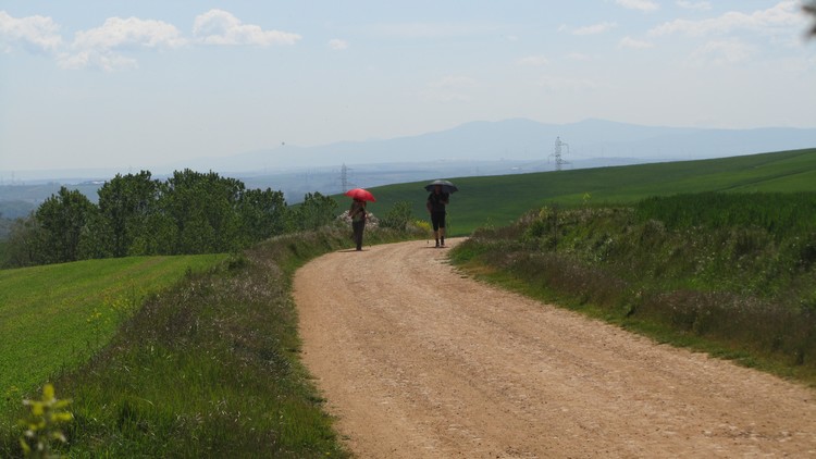 A l’approche d’Hornillos, nous rencontrons des pèlerins jamais vus. A part une jeune fille qui marche seule en sandales et que nous avons repérée. Elle change de collants tous les jours, de couleurs très vives on ne peut les oublier.